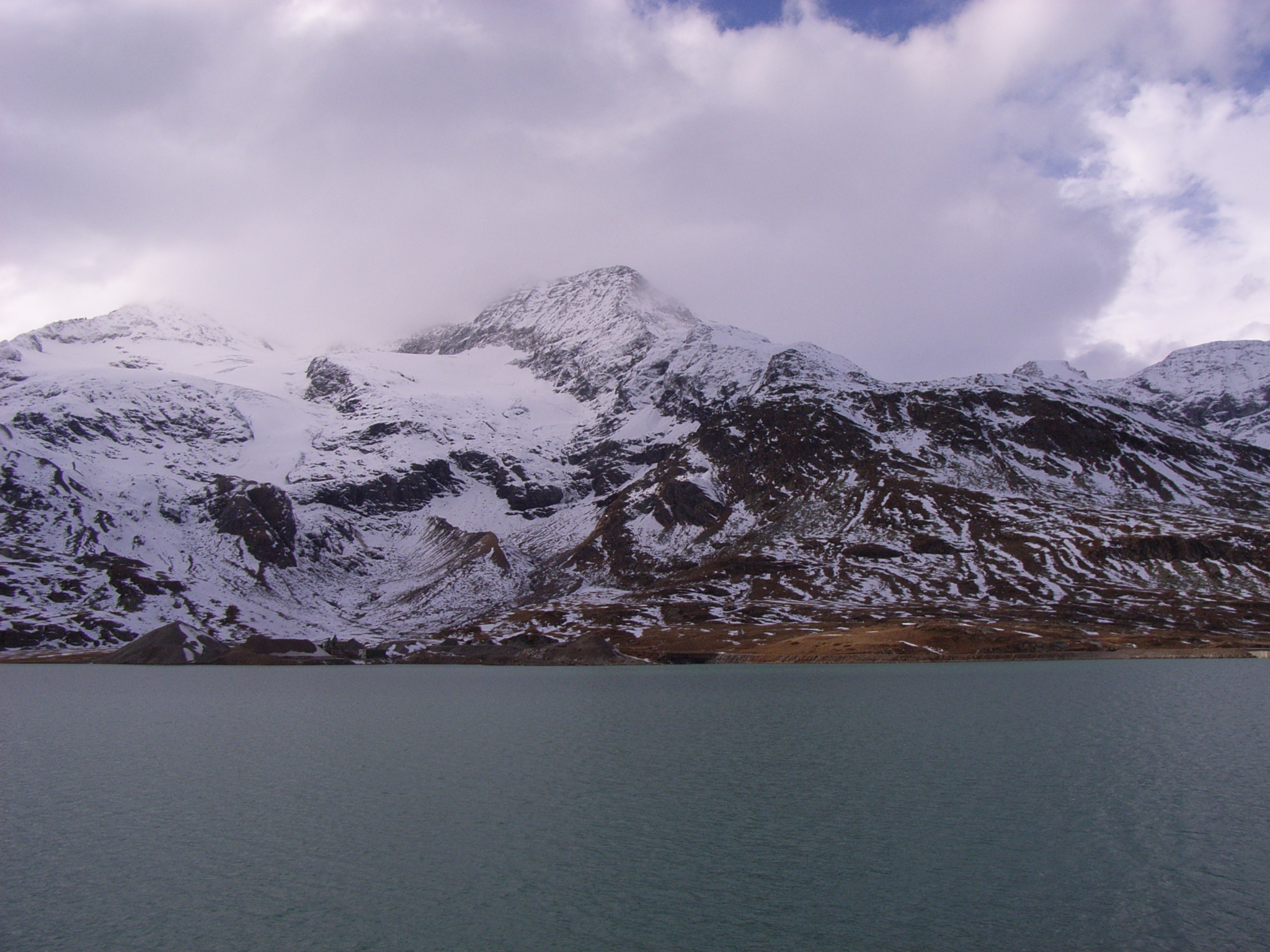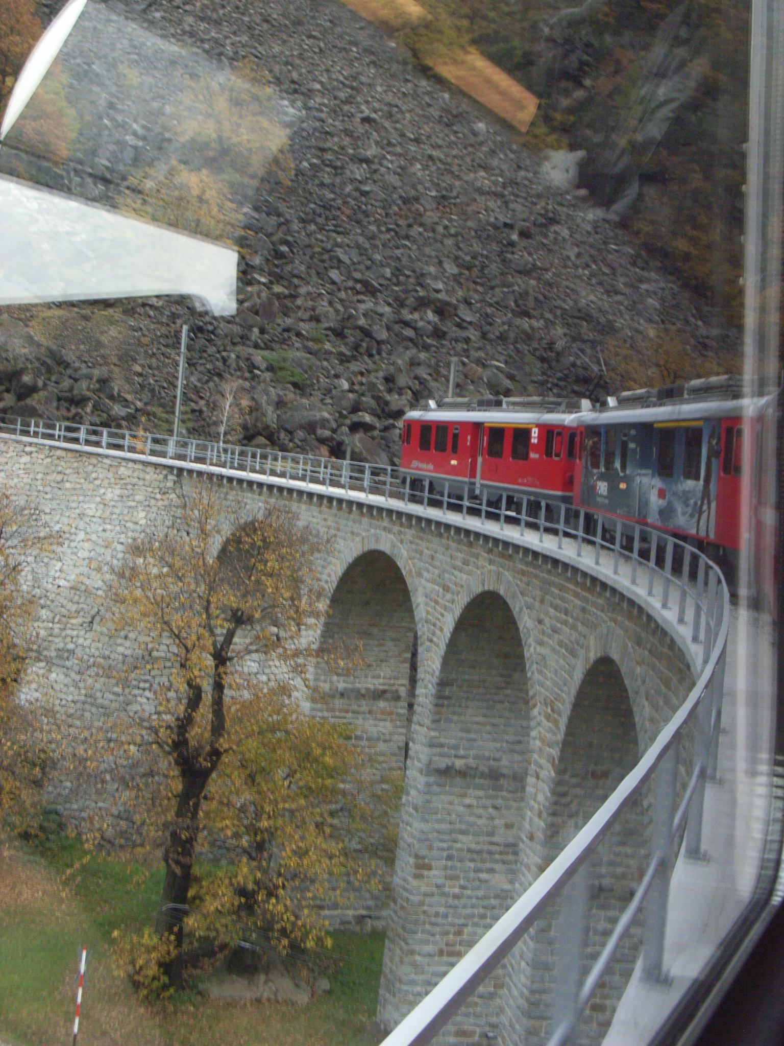 Domenica mattina non possiamo poltrire a letto e ci consoliamo con una colazione oltre ogni aspettativa, l’elenco delle delizie che troviamo sulla tavola non rende l’idea della loro bontà. Ci sono ben due torte fatte in casa, biscotti, yogurt, latte, cereali, frutta fresca, succo di mela. Ci scaldiamo con tè e caffè, insomma facciamo una mega colazione grazie alla quale potremmo sentirci sazie per quasi tutta la giornata. Peccato partire, ma è ora di prendere il trenino rosso del Bernina! E fuori, tanto per cambiare, piove. Lasciamo l’auto in un grande parcheggio, con un sottopassaggio ci portiamo in stazione e saliamo su un treno rosso fiammeggiante, dotato di vetrate panoramiche nelle carrozze centrali, spazio per le biciclette e carrelli portasci. Si parte!