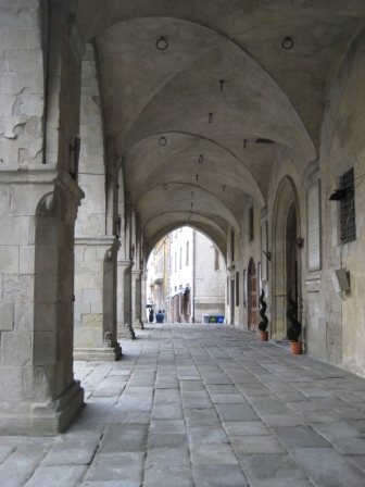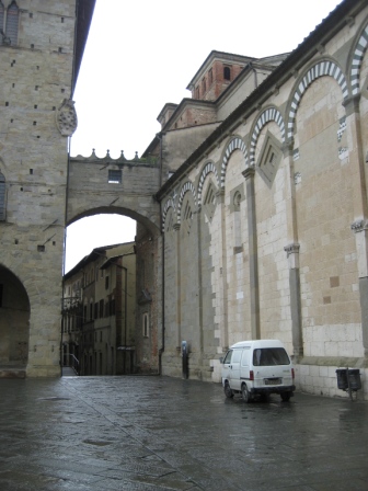 ma anche la banca, Palazzo del Podestà e Palazzo dei Vescovi. Avremo tempo di passeggiare tutti insieme con la guida, ora aspetto e osservo la città sotto i portici del Palazzo del Comune,