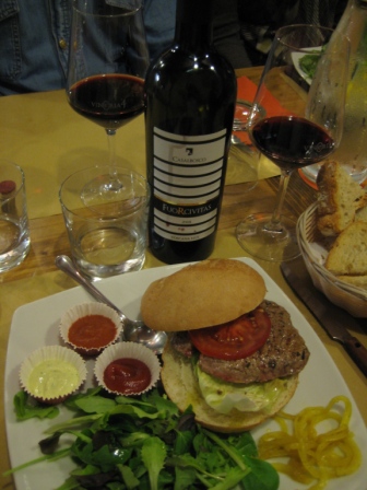 Hamburger di chianina è la portata principale, a chilometro quasi zero, ben lungi dalle proposte dei fast food, perché tra i bovini la razza principale toscana è proprio la chianina con i suoi differenti tagli. Questa ottima cena è accompagnata proprio dai vini della Fattoria Casalbosco.