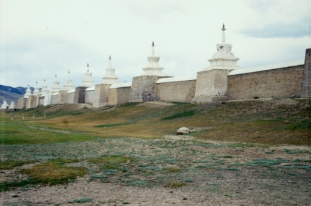 Mangiamo pane e formaggio. Lost in Mongolia ci diciamo, potremmo esserci persi in quanto non c’è mai un cartello, una freccia che ci indichi la via; Tsojoo ha una guida eclettica, quando rallenta per capire la direzione da prendere fa la faccia seria, poi con sicurezza ci porta a destinazione. Ascoltiamo dal suo ipod le hit mongole del momento alternate a musica “occidentale”, diffusa da un impianto improbabile fatto in casa. Cantiamo. Il cielo si è fatto grigio e carico di nuvole, poi pioviggina. Kharakhorum è la ns meta del pomeriggio, ora ridotta a un agglomerato disordinato di edifici su una spianata senza nulla di bello, ma un tempo prestigiosa capitale dell’impero. Dalla collina di fronte si vede il complesso di Erdene Zuu con i celebri 108 stupa che racchiudono templi e palazzi antichi.