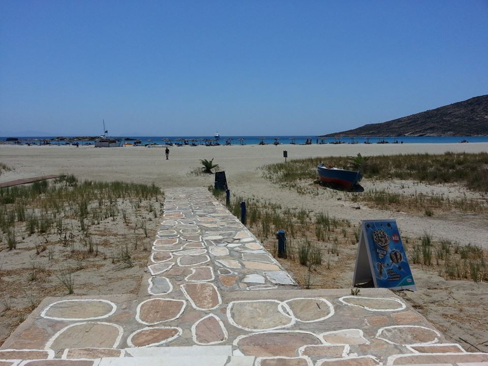 In una baia ampia a cui seguono altre baiette, l’ampia spiaggia di sabbia dorata ospita due ristorantini semplici, qualche decina di ombrelloni, un minimo di attrezzatura e servizi e un paio di barche in secca.
