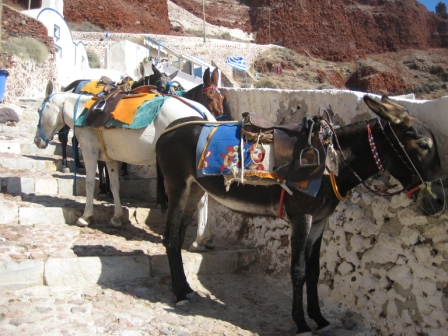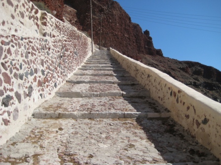 Quaggiù a Hammoudi non ci sono più i pulmini per tornare a casa, così io e Simo saliamo coraggiosamente i famosi 260 scalini della vecchia mulattiera che ci riporta al centro di Oia, sotto un sole ancora caldo.