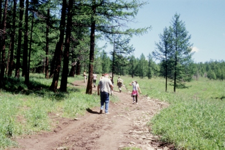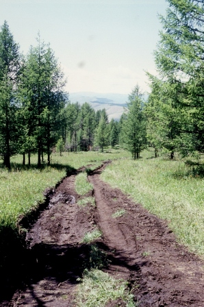 Noi stessi impieghiamo quasi 3h per salire in fuoristrada tra erba altissima, boschi di conifere (molto danneggiate dal vento e dai parassiti) e guadi di fiumi, finché a una spianata nel bosco parte il sentiero che sale sulla montagna.