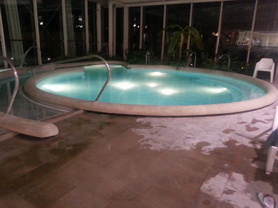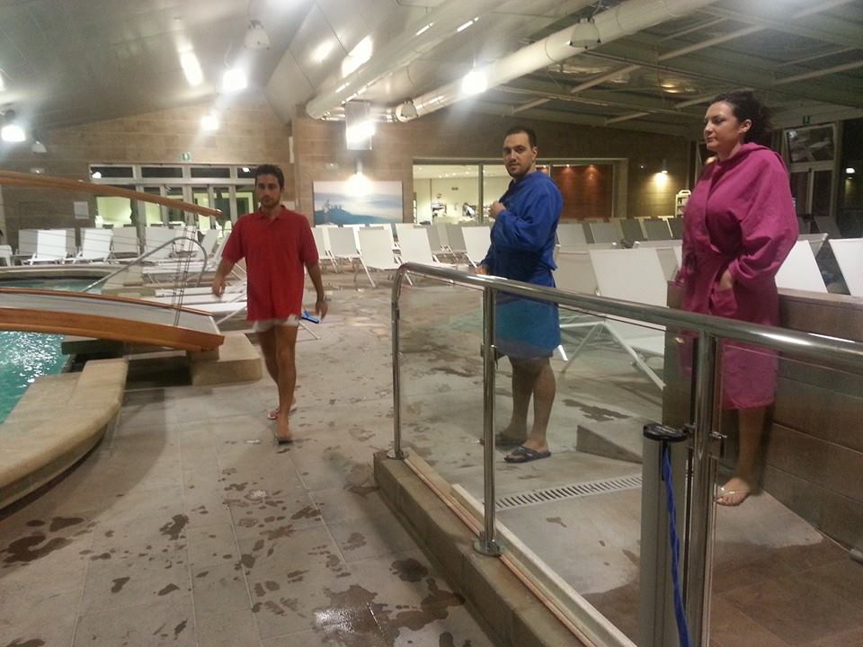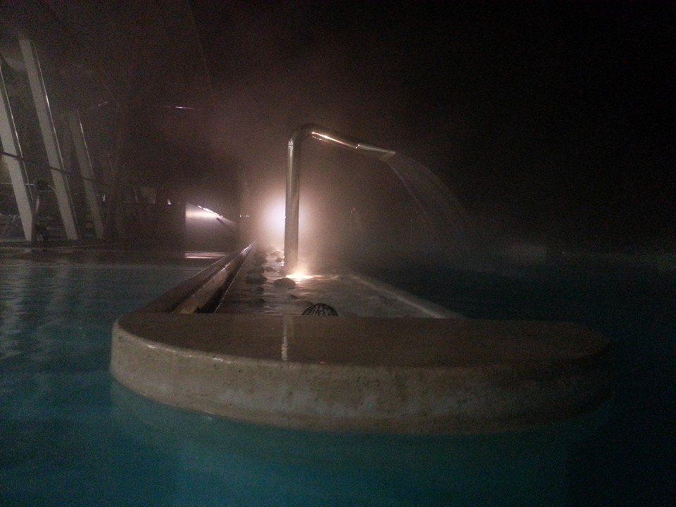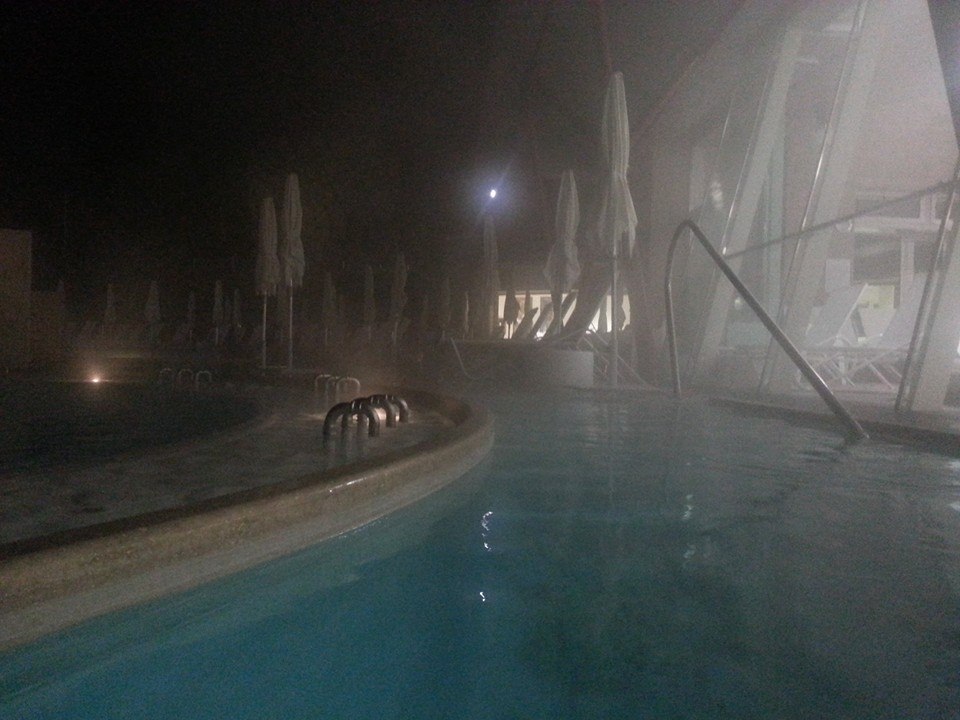 Il tutto è illuminato da luci tenui e ovattato da umidità e nebbiolina, fantastico! Gli oltre 500 metri quadrati di superficie totale delle piscine sono ora particolarmente godibili perché sono quasi solo per noi.
