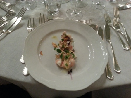 Io ero al tavolo Prataiolo, e al centro assieme a un mazzo di rose rosse campeggiavano appunto tre bei funghi prataioli. Abbiamo iniziato con ben due antipasti: scampi al vapore, insalatina di porcini e scaglie di primo sale;