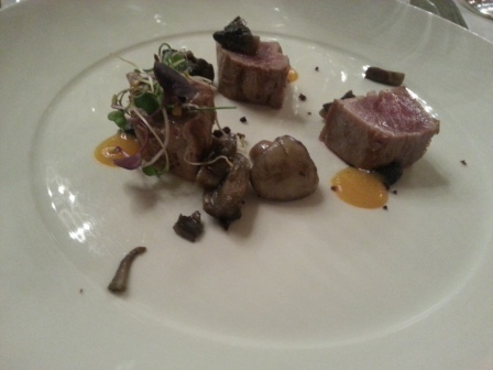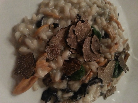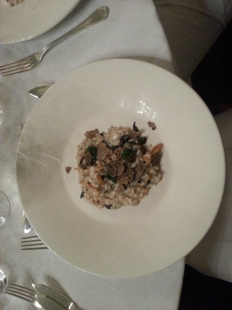 Il primo piatto è stato per me una scoperta, buonissimo e assai equilibrato, bellissimo da vedere: risotto al tartufo estivo, crema di finferli gialli e neri con emulsione di mascarpone e spinaci.