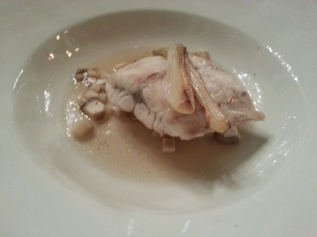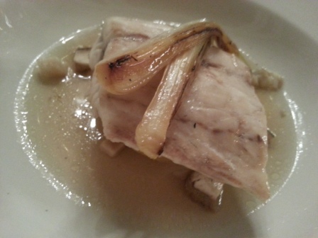 Per secondo siamo tornati a un piatto forte, il pesce del ristorante Marcandole: branzino al vapore con patata, cipollotto caramellato e consommé di porcini.