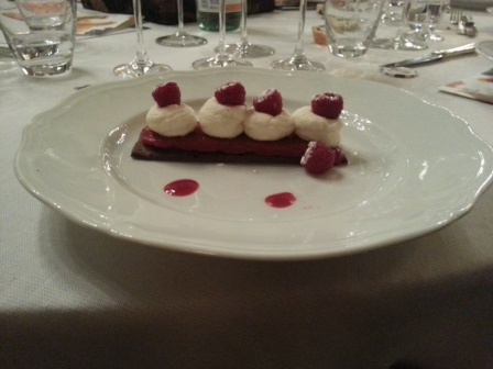 Ammesso che ci fosse ancora posto per un dolce, l’abbiamo mangiato solo per gola, e ahimè la foto è pure uscita sfuocata: biscotto al cacao, ganache al cioccolato bianco con fave di tonca e gelée di lamponi.