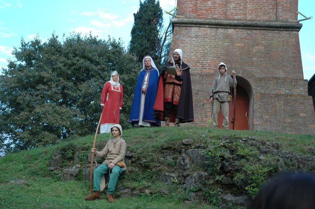 La cripta è la parte più antica del sito cinto da mura, dove facciamo un balzo all’indietro nella storia fino al primo insediamento di epoca romana, dedicato ai culti pagani. Saliamo poi in cima al colle dove c’è la piccola chiesa moderna e il sito dove si consumò l’eccidio degli Ezzelini, in un luogo scosceso, irraggiungibile con truppe a cavallo. Attorno ai figuranti che recitano in costume si svolgono tenzoni simulate.