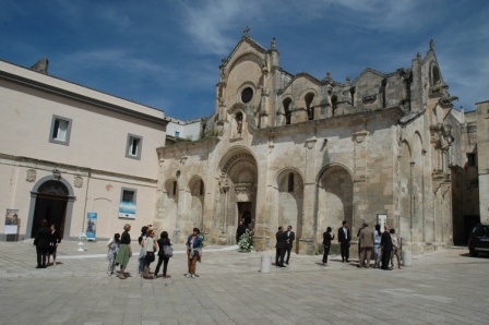Venerdì mattina arrivano loro, ma abbastanza tardi da permettermi di passeggiare da sola un paio d’ore, una libertà che apprezzo prima e dopo. Saliscendi, spazi ampi e angusti si susseguono tra i sassi. Matera assomiglia davvero a Venezia, fuori dai percorsi turistici non c’è quasi nessuno, nonostante sia il primo maggio e siamo in un fine settimana affollatissimo, ho dovuto fare i salti mortali per trovare alloggio. Una bella chiesa si prepara ad accogliere una coppia di neosposi, oltre ad avere un sagrato perfettamente addobbato ha anche un interno ricchissimo, allietato da musica d’organo particolarmente indicata.