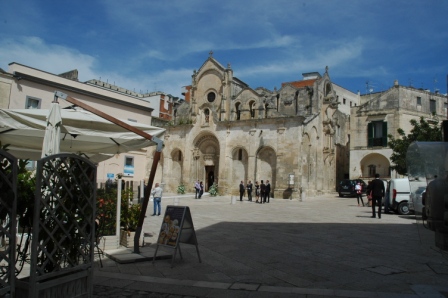 Piazza Vittorio Veneto è il centro nevralgico di Matera con tanti bei negozi, locali e palazzi eleganti, da qui si dipanano varie strade, si accede al Sasso Caveoso e al Sasso Barisano. All’ora di pranzo in una bella gastronomia prendiamo pane, formaggio e affettati, li consumiamo sulle vicine scale poi beviamo un caffè in un bar elegante. Prendiamo l’auto per visitare il Parco della Murgia materana, poco distante dal centro. Questo luogo era abitato già in epoca paleolitica e oggi si presenta come un insieme di edifici diroccati scavati nella roccia, luoghi di culto e abitazioni, ricoveri per gli animali, tutto incastrato e seminascosto nel verde.