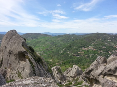 Con il sindaco saliamo in cima alla Rabata, il nucleo antico dell’abitato dove sorge il castello normanno; siamo nell’alta valle del fiume Basento, in una posizione dominante che ha fatto di Pietrapertosa un punto di passaggio di popoli diversi che qui si sono incontrati e scontrati, da prima della dominazione romana e fin quasi ai giorni nostri. Laddove sorge un arco naturale si trovava un posto di sentinella che oggi offre un’amplissima vista a valle. Gli ambienti del castello oggi restaurati sono parzialmente visitabili, danno uno stimolo ulteriore ai visitatori che si spingono fin quassù e ne ricompensano ampiamente le fatiche.
