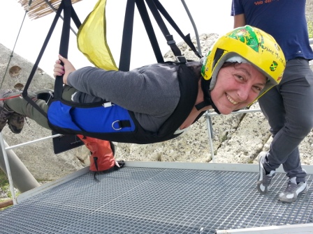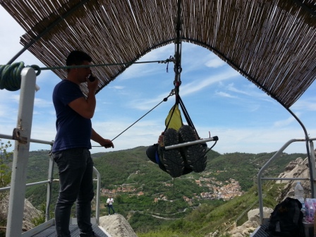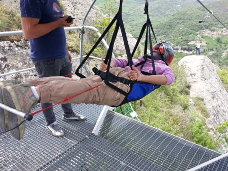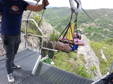 In primavera ed estate infatti c’è un motivo in più per venire qui: provare il brivido di volare, scendere dalla cima di un paese giù a fondovalle per poi risalire dall’altra parte e ridiscendere, saldamente imbragati, legati a un filo d’acciaio e in totale sicurezza, per un paio di minuti lunghissimi, interminabili. Il volo dell’angelo attrae visitatori vicini e lontani e forse il primo giugno prossimo lo farò anch’io, un anno fa ho visto e sentito l’emozione delle bloggamiche Cristina e Simonetta. Le ho immortalate in questi pochi minuti di adrenalina pura che hanno raccontato in questi post.