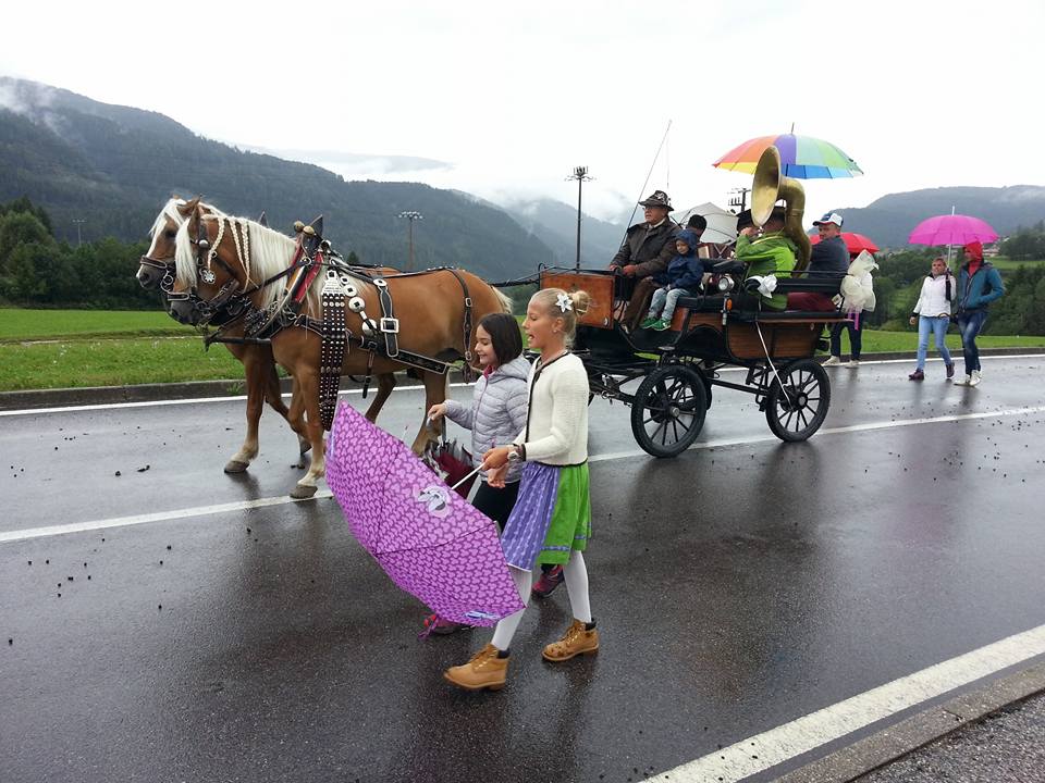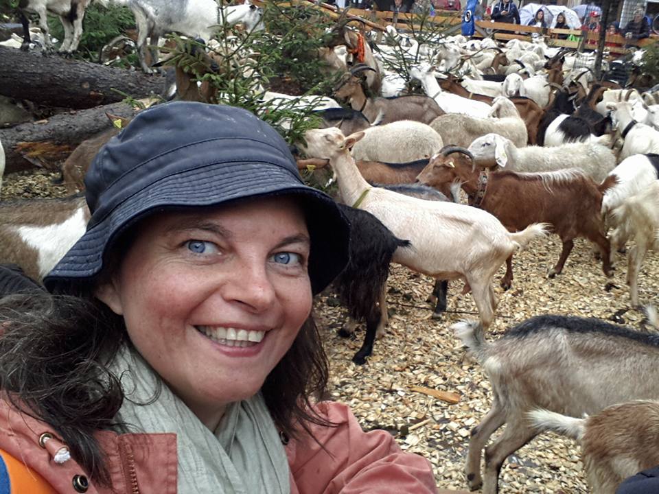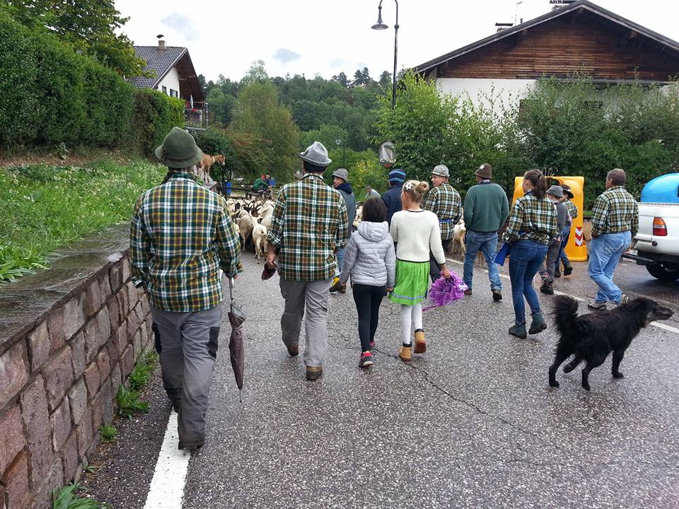 Come le dive di Hollywood le capre si fanno attendere e poi, sempre come dive, si annunciano con uno scampanellio inconfondibile che mi emoziona. Sì ho il cuore che batte quando rigirandomi verso la spianata di prima sento tintinnare tanti campanellini. E sì hanno un altro tratto distintivo le capre, l’odore acre che si sente da lontano, che può non piacere ma adesso ci sta. Le sento in tutti i sensi e poi spuntano da dietro la curva, a decine. Sono un unico grande gregge che procede in fila disordinata, come si conviene a delle bestie che quando possono scorrazzano nei prati e mangiano tutti i vegetali che trovano sul loro cammino. Pensate ai luoghi comuni e alle metafore create sulle capre, sappiate che è tutto vero. Sono diverse per dimensioni e colore del manto, le somiglianze svaniscono grazie ai fiocchi e ghirlande che ne ornano il muso e il collo. Sono bellissime e faccio tante foto. Ma non ci sono solo loro: giovani e adulti in fila le precedono e altri chiudono la fila. C’è una carrozza trainata da cavalli e ci sono i padroni delle capre, i loro orgogliosi guardiani che le coccolano, ma quando necessario brandiscono un bastone perché non sono bestie disciplinate eh. Beh si sa, le capre brucano qualsiasi cosa come ho detto, e facilmente le vedo sgattaiolare (posso scrivere così??) nei giardini lungo il percorso pronte a far fuori siepi e fiori. I proprietari non sono affatto contenti e allora una strigliata arriva. Le prime volte mi spiace ma tutto sommato non le scalfisce troppo, e alla successiva occasione di svicolare dal cammino beh, non se la lasciano scappare.