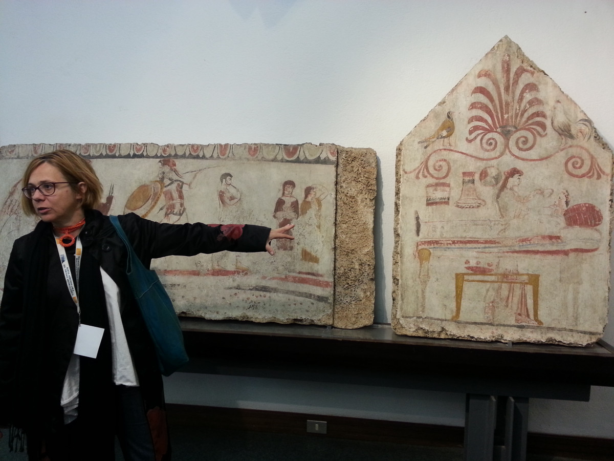 La tomba del tuffatore è il momento più bello della visita al museo, la visione che supera ogni aspettativa dopo essermi già riempita gli occhi di bellezza. Vedere dal vivo queste cinque lastre di pietra dipinta, con un dentro e un fuori, un sopra e un sotto, è davvero emozionante. Ci racconta la sua storia prima un video multimediale, poi la guida, in una spiegazione completa e istruttiva. Per chi andrà a Paestum nelle prossime settimane segnalo L’immagine invisibile, la mostra inaugurata il tre giugno scorso e aperta fino a ottobre, dedicata proprio alla tomba del tuffatore. Voglio spendere due parole per Ilaria Varriano il mio angelo custode per la parte storico archeologica di Paestum, ve la consiglio caldamente come guida perché è davvero brava, competente e preparata. Da buona napoletana (posso dirlo?) aggiunge un po’ di sale ai suoi contenuti grazie alla verve teatrale e alla capacità di incalzare i suoi ospiti con argomenti e aneddoti azzeccati. Che siate grandi o piccini, imparerete molto da lei, grazie Ilaria! Perché ho sottolineato le sue competenze storiche e artistiche? Perché c’è un’altra Paestum da scoprire oltre il sito archeologico propriamente detto.