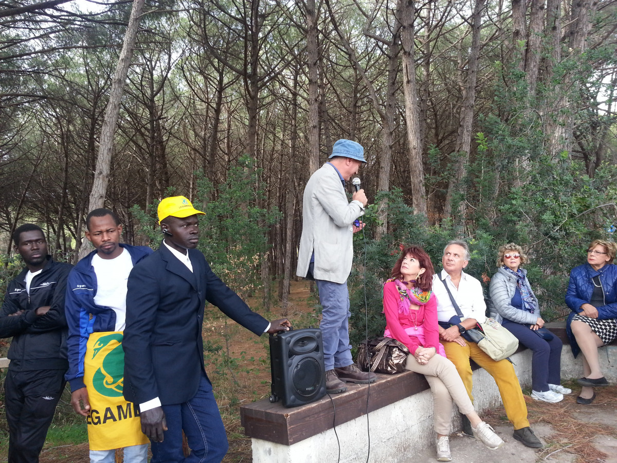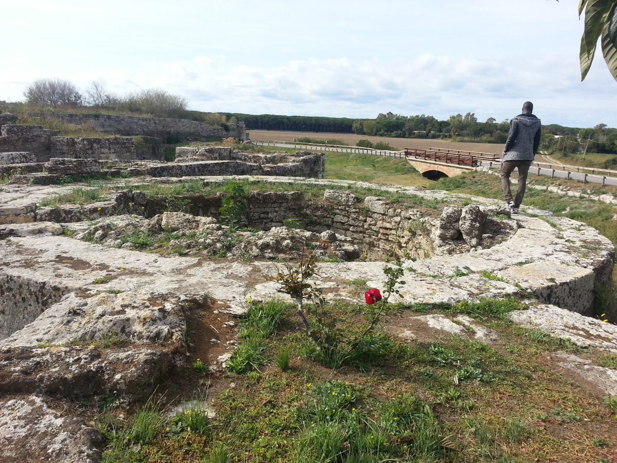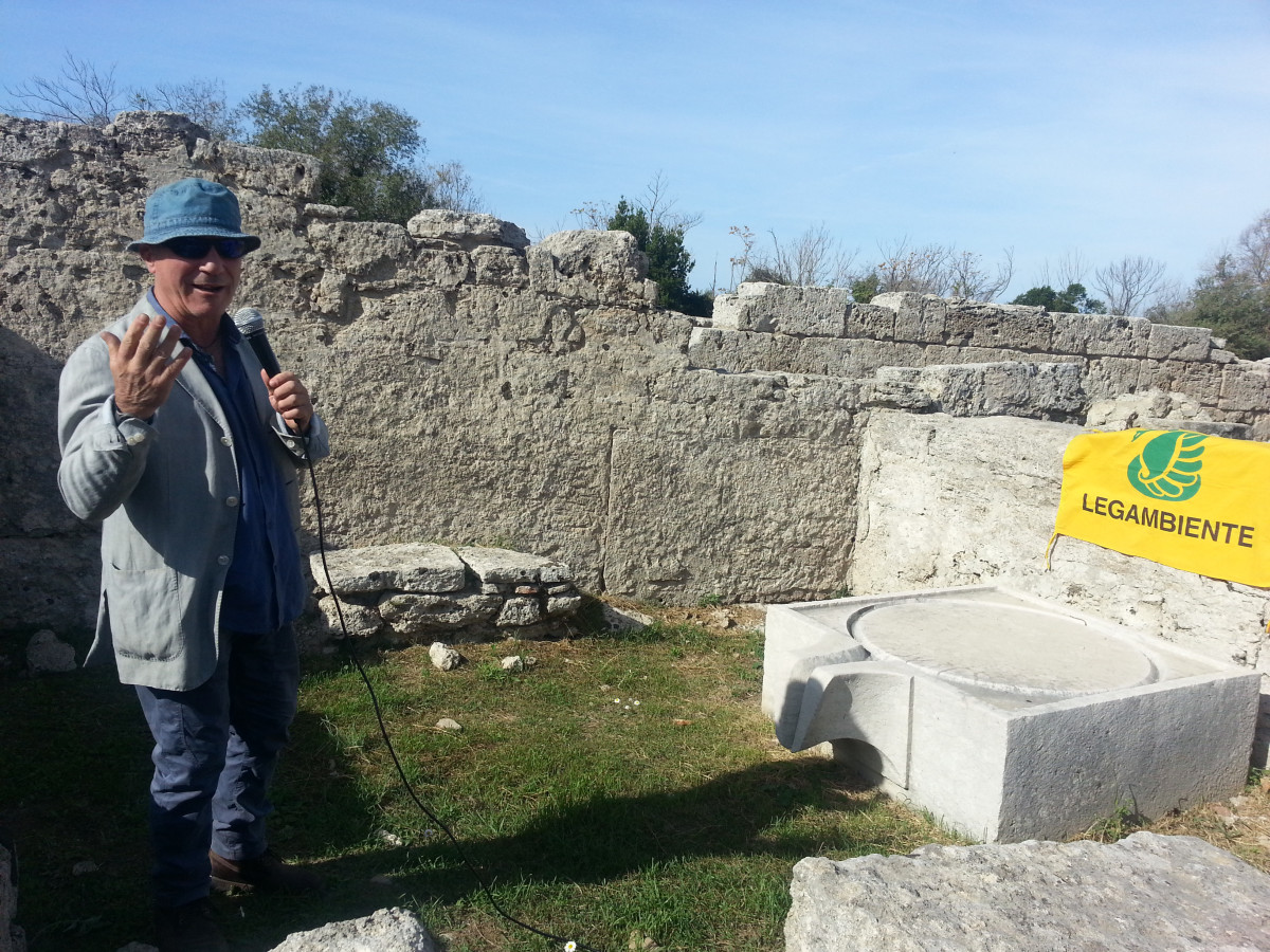 Roberto Paolillo ne è il referente e coordina una bella squadra di italiani e stranieri, i richiedenti asilo ospiti del centro d’accoglienza di Capaccio Paestum. La visita inizia dal decumano principale lungo il “Sentiero degli Argonauti” che, secondo la leggenda, assieme a Giasone cercavano il vello d’oro. Arrivati alla foce del fiume Sele avrebbero fondato il santuario di Hera. Arriviamo dapprima a Porta Marina sul lato occidentale del sito, impressionante per le proporzioni delle mura alte sei metri e oltre, che dall’alto si vedono bene (sono lunghe quasi cinque chilometri). Mentre la porta è ben conservata, le mura non sono sempre in buono stato di conservazione, mi dicono che qualche simpatico personaggio “prelevi” di notte dei pezzi delle mura, con tanto di muletto, per uso personale. Come fosse un albero di ulivo, un ornamento da mettere all’ingresso di casa. Non ho parole. Per fortuna la natura ci riserva il suo lato migliore, tra campi coltivati e un grande bosco di pini marittimi si aprono scenari diversi; le colline sullo sfondo sono il luogo di passaggio dei popoli che vi si stabilirono, dopo la dominazione romana. Siamo nel parco delle dune costiere, oltre il bosco si apre una lunga spiaggia ben curata con sentieri e pannelli esplicativi, curati sempre da Legambiente che tiene qui i propri campi estivi. Ogni prima domenica del mese il Parco Archeologico di Paestum è ad l’ingresso gratuito, il biglietto dà accesso anche alla visita dell’oasi dunale.