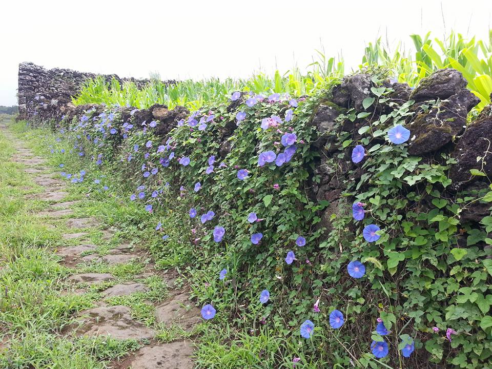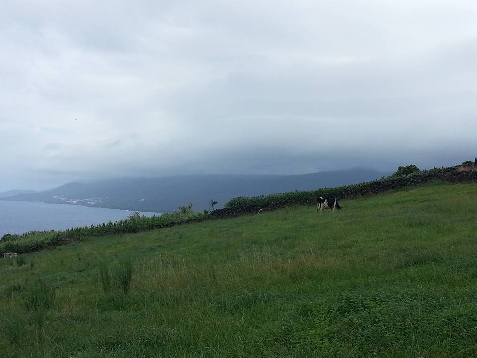 Al noleggio ho preso la cartina dell’isola con i percorsi consigliati in bici, andando verso est c’è una bella salita e da qui inizia il percorso delle vigias. Lajes è il centro dell’epopea eroica e sanguinosa della caccia alle balene, finita trent’anni fa ma ancora presente nell’animo degli abitanti che per fortuna hanno convertito in risorsa turistica il loro mestiere crudele, durissimo, pieno di rischi. Le vigias sono bianche torri di avvistamento dei cetacei, ora parzialmente in disuso, situate sul dorso della collina che scende a picco sull’oceano. Il versante sud di Pico è luogo d’elezione per gli avvistamenti, luogo di passaggio dei grandi mammiferi marini. Alcuni proprietari stanno convertendo le vigias all’ospitalità. Propongo un primo giro verso est di quattro chilometri, un partecipante mi dice che non sale nemmeno sulla bici per così poco ma subito si ricrede, qui c’è da pedalare e faticare parecchio. Io scendo spesso con la scusa di scattare foto poi salgo in sella e proseguo, tra una vigia e una chiesetta, un cavallo e altri animali al pascolo, viste superlative sulla costa frastagliata. Il nostro giro in bici si svolge su e giù per stradine ripide e sterrate. Il partecipante più allenato alle due ruote prende velocità, va avanti e quando non ci vede arrivare torna indietro sembra un criceto sulla ruota, impazzito, su e giù, su e giù. Dai venite! Ci chiama mentre noi procediamo lentamente. Pedalare è difficile ma i paesaggi ampiamente ricompensano la fatica. Arriviamo al paese successivo, torniamo indietro per un pezzo poi risaliamo su uno sterrato con dei ricoveri per i maiali, che non si vedono ma… si sentono. Muretti a secco scuri sono ricoperti da campanelle rampicanti viola, a terra altri fiorellini colorati allietano una vista già stupenda. Due ore volano via e rapidamente facciamo il cambio, noi primi otto coi secondi otto. Non piove da un paio d’ore e noi (i primi) siamo stati più fortunati perché ora staremo al coperto del museo mentre i secondi otto seguono le nostre tracce e, alla fine della salita, trovano uno scroscio d’acqua come un muro che li rende fradici in un attimo e li costringe a tornare presto alla base, che sfortuna! Un pranzetto di pesce in un ristorantino ora è quello che ci vuole, e a tavola ci troviamo alla fine del giro di Lajes.