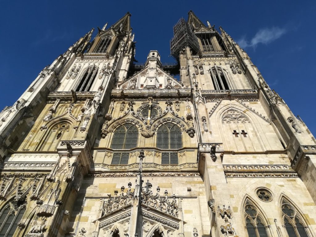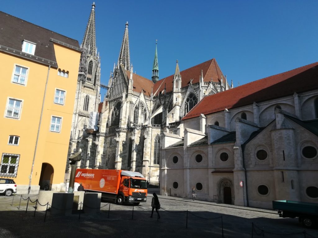Vado a vedere il duomo dedicato a San Pietro, capolavoro del gotico fiorito, in solitudine. Regensburg (continuo a chiamarla col nome tedesco) si è svegliata da poco e ci sono poche persone in giro. La facciata è rivolta a ovest e viene illuminata dal sole nel pomeriggio; lo spettacolo verticale all’esterno si trasforma in un merletto nell’interno a tre navate, nonostante molti rimaneggiamenti barocchi e neogotici siano stati aggiunti, assieme a grandi vetrate colorate, quadri e sculture.