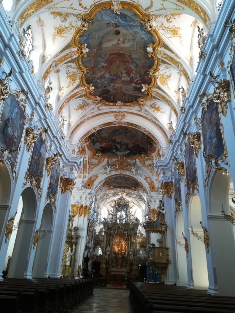 Dalla porta posteriore si accede al retro del duomo altrettanto interessante: i lavori in corso non impediscono la vista del possente edificio. Vi ho detto che ci sono tanti cantieri a Regensburg? Ed è una cosa positiva nonostante i temporanei disagi, in Germania si fanno i lavori dall’inizio alla fine, presto e bene. L’altra chiesa che visitiamo, Alte Kapelle, di costruzione successiva, luccica nel suo bianco e oro è un vero gioiello del barocco rococò.