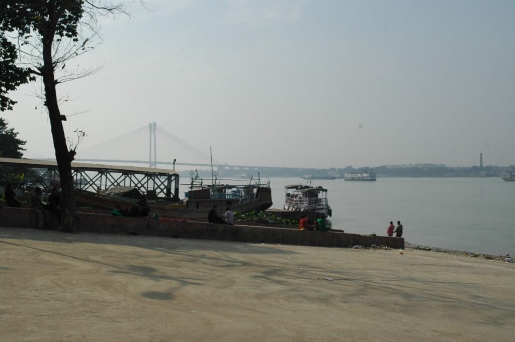 Sullo sfondo davanti a noi si staglia un grande ponte moderno che attraversa il Gange.