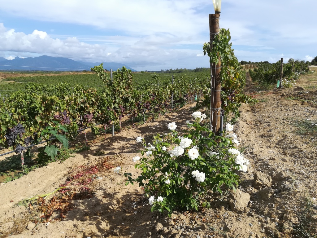 Questo è il nome della vicina azienda vinicola che coltiva ben 200 ha di vigneto. Anche se sono decisamente troppi per i miei gusti e la mia costante ricerca di piccoli produttori, essa offre un utile spaccato di cosa può essere l’impresa agricola qui in Corsica. Gli attuali proprietari hanno acquistato nel 2011 la vecchia cantina e con un grande progetto l’hanno portata a nuovi e più elevati livelli. Che bella visita! La vendemmia è in pieno svolgimento, ci muoviamo con circospezione fra le ceste piene d’uva, i trattori e i raccoglitori.