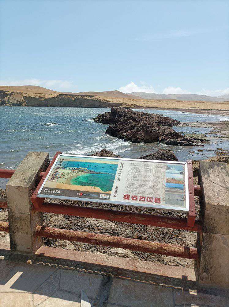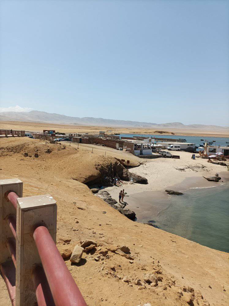 Le minacce dei cambiamenti climatici occupano molto spazio, chissà che succede qui se si alza il livello del mare! Ci fermiamo alla spiaggia rossa con il suo mirador bellissimo, poi è ora di mangiare. La pausa pranzo è in un ristorantino con vista su una baia tranquilla, riparata, dove prendo un ceviche stupendo e una birra fresca perfetta. Cusqueña de trigo. Pisco sour shottino per iniziare e brindare ai due compleanni. Prima di pagare il conto sento parlare italiano al tavolo vicino e sì, sono i quattro amici che hanno volato con me da Madrid a Lima con Air Europa, com’è piccolo il mondo! Vado a salutarli, mi presento, ci scambiamo un contatto Facebook che rimane ancora nel 2024 poiché Maurizio, uno di loro, abita a Treviso. Nei mesi seguenti più volte ci incrociamo senza trovarci dalle nostre parti. Carinissimi tutti, da bravi pensionati (che invidia) si preparano a passare due mesi in Sudamerica poi tre rientrano e uno si ferma a svernare in Brasile…